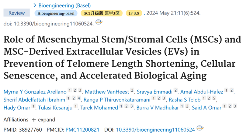 [1]Arellano, M. Y. G. et al. Role of Mesenchymal Stem/Stromal Cells (MSCs) and MSC-Derived Extracellular Vesicles (EVs) in Prevention of Telomere Length Shortening, Cellular Senescence, and Accelerated Biological Aging. Bioengineering 11, 524 (2024).