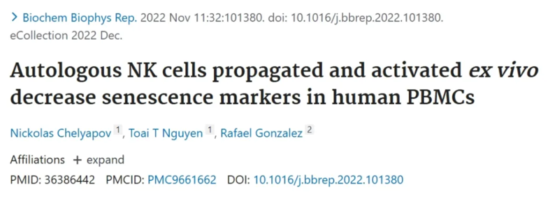 [5] Chelyapov N, Nguyen TT, Gonzalez R. Autologous NK cells propagated and activated ex vivo decrease senescence markers in human PBMCs. Biochem Biophys Rep. 2022 Nov 11;32:101380.