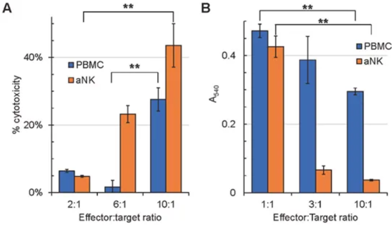 通过细胞毒性实验,研究人员发现,自体扩增激活的NK细胞在体外展现出了更强的、剂量依赖性的细胞毒性活性,能够更有效地针对K562细胞(一种常用的靶细胞)以及衰老的人类皮肤成纤维细胞。