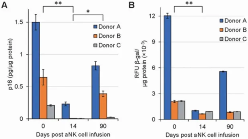 研究中,3名受试者首次接受1.0×10⁹个aNK细胞输注后,第14 天这两种标记物水平均显著下降,且无论年龄大小,都能观察到免疫衰老减轻的效果。