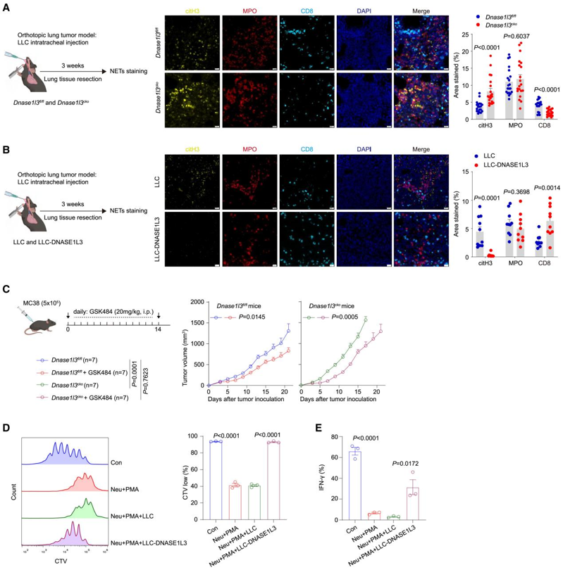 机制研究表明,树突状细胞通过分泌DNASE1L3酶切降解NET,解除NET对CD8⁺ T细胞的物理与化学屏障,促进T细胞向肿瘤内部浸润,并延缓其耗竭。动物实验中,瘤内注射DNASE1L3不仅显著抑制肿瘤生长,还提高了T细胞数量及功能活性,降低耗竭标志物表达。