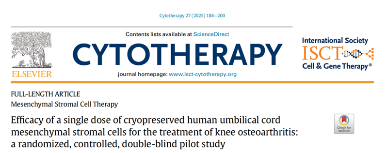 [5]Omar Amado Pico,Francisco Espinoza,María Ignacia Cádiz, et al. Efficacy of a single dose of cryopreserved human umbilical cord mesenchymal stromal cells for the treatment of knee osteoarthritis: a randomized, controlled, double-blind pilot study.. Cytotherapy. 2024;0 (0):0-0. doi:10.1016/j.jcyt.2024.09.005